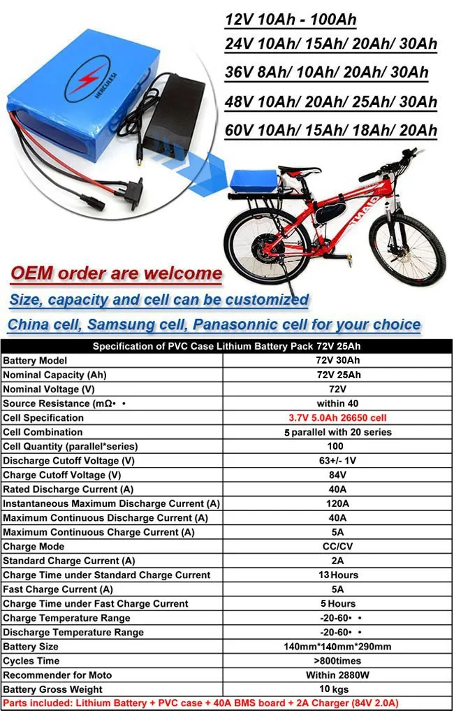 Customized OEM 72V Electric Bicycle Battery Pack 25AH 72V Li-Ion Lithium Battery Pack in 26650 Cell 40A BMS 2A Charger Free Shipping For this 72V 25Ah Lithium Battery Pack: Recommend to use for 72V 100W -72V2880WMotor. The Charger applys to 100V-240V voltage. What's the Specifications of our Electric Bike Battery 72V 25AH Lithium Ion BatteryPack? What's the Details of our72V 25Ah Lithium LiIon Battery Pack? What's the Applications of our 72V 25Ah Lithium ion Battery Packs? Our Similar Batteries Highly Recommend PVC Cased Electrci Bicycle Battery 48V 20Ah built in 3.7V 2200 mah 18650 cell 30A BMS and 54.6V 2A ChargerUS $ 408.00/piece Top Classic 1000W Electric Bike Battery 48V 20Ah built in 2200mah 18650 cell 30 Amp BMS + 54.6V 2A Charger FREE SHIPPINGUS $ 408.00/piece High Quality 1000W PVC Cased Electric E Bike Lithium Battery 48V 21Ah with Samsung 3.7V 3000mah cell 30A BMS + 54.6V 2A ChargerUS $ 468.00/piece Top Classic PVC Cased Electric Bike Battery 48V 30Ah built in 3.7V 3000 mah Samsung 18650 cell 30A BMS and 54.6V 2A ChargerUS $ 629.00/piece Deep Cycle PVC cased 48V 15Ah Lithium battery Pack for Electric Bicycle Scooter built in 18650 cell 15A BMS with 2A ChargerUS $ 315.00/piece Hot selling Electric Bicycle Battery 48V 15Ah Lithium battery built in 18650 cell 15A BMS with 54.6V 2A Charger FREE SHIPPINGUS $ 315.00/piece High Quality Samsung 18650 cell PVC cased 48v 15Ah lithium ion bike battery with 15 Amp BMS and 2A Charger FREE SHIPPINGUS $ 380.00/piece Deep Cycle Samsung 18650 cell PVC cased 700W Ebike lithium battery 48V 15Ah with 15 Amp BMS and 2A Charger FREE SHIPPINGUS $ 380.00/piece Lithium batteries are presently the most commonly used energy storage devices on electric bike, electric scooter, golf car, mobile phones, laptops, digital cameras and other electric devices. Learning how to maintain lithium batteries can not only prolong battery lifetime but also protect your device from potential damage. 1.Charge new batteries.It's not necessary to charge over 12 hours when first used. When a device powered by batteries is purchased, sellers will usually tell us the batteries must first be charged 12 hours before using. Actually, this is unnecessary. Unlike common Ni-CD or Ni-MH batteries, most lithium ion batteries are activated before leaving the factory. Due to their low self-discharge, it’s unnecessary to charge lithium ion batteries for such a long time when new. Lithium ion batteries are ready for use when the charger indicates so, and they will reach their best capacity after 3 or 5 cycles. 2.Use appropriate chargers.Many people take great care with their electronic gadgets, but often neglect the consequences of bad chargers on their lithium ion batteries. When choosing a charger, the original charger is the best choice. If that's unavailable, a high quality charger that has an overcharge protection function, or a brand name charger will do. A low quality battery charger can lead to shorter run times, premature battery failure, or even fire or explosion. 3.Avoid frequently over charging.Over charging with a low quality charger may let the battery's interior rise to a high temperature, which is bad for the lithium ion battery and charger. Thus, simply fully charging is good enough - overcharging will make your lithium battery into a little bomb if overcharge protection function is missing. 4.Avoid touching metal contacts.All batteries' contacts need to be kept clean for best performance. When carrying batteries around, do not let the contacts touch metal objects such as keys; this could cause a short circuit, damaging the battery or potentially resulting in a fire or an explosion. 5.Avoid using often in high or low temperature environments.Lithium ion batteries have optimal working and storage temperatures. If they're continually used in extreme temperature environments, this will negatively affect battery use time and useful cycles. 6.Avoid long periods without using or recharging.If batteries will be left unused for 3 months or more, partially recharge them (to around 30-70% of capacity, depending on planned storage time), then store the device to prevent battery damage. You may need to take the device out of storage and charge again after a few months. Why Choose us and What about our Factory? 1.WespecializedinLiFePO4New energy vehicle power Battery,Lithium ionBattery Engine Start Battery, Backup Storage Battery for Communication base stations, solar & wind hybrid energy storage and household energy storage battery system solutions. 2.Inspected by the Inspection Institution ofSGS. 3.100% QCinspection Before Shippment. 4.CE/RoHslisted,competitve price. 5.We haveAfter-sales service 1. Quick response to clients' enquiries within 24hours. 2. Best solution providedby our experienced team andprofessional engineers. 3. More than 10 years experience in producing battery products for various application. 4. Value quality and long-term cooperation to reach win-win relationship. 5. Our Partneers thoughout 103 countries. 6. 365 companies used our products which are very satisfied. How to deliver the battery to you? 1. Orders processed timely after the payment verification. 2.We only ship to confirmed order addresses. Your order address MUST MATCH your Shipping address. 3. SERVICE TRANSIT TIME is provided by the carrier and excludes weekends and holidays. Transit times may vary, particularly during the holiday season. 4. Delivery time depends on destination and other factors, If you didn't received the item after 20 days, please contact us. What 10 Tips should be note when using Lithium ion battery? Warnings: Do not immerse the battery in water or seawater, and keep the battery in a cool dry surrounding if it stands by. Does not use or leave the battery near a heat source as fire or heater Use the battery charger specifically for that purpose when recharging. Do not reverse the position and negative terminals. Do not connect the battery electrodes to an electrical outlet. Do no